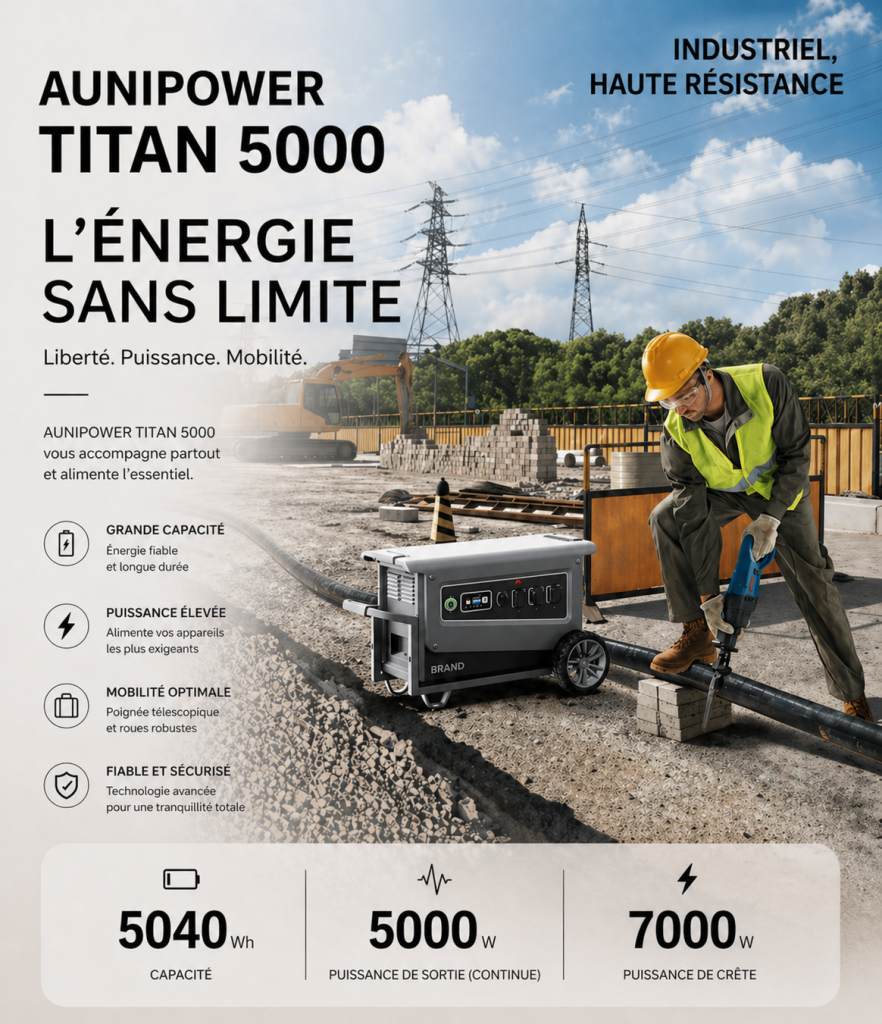 Conçue pour les environnements exigeants, la AUNIPOWER TITAN est une station d’énergie portable robuste, idéale pour l’industrie et les chantiers.