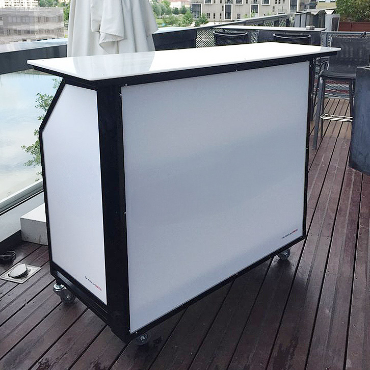 Dimensions bar replié: 150x30x135cm Réalisé en structure aluminium noire 25x25x2mm et habillé de panneaux acrylique blancs ép. 8mm.